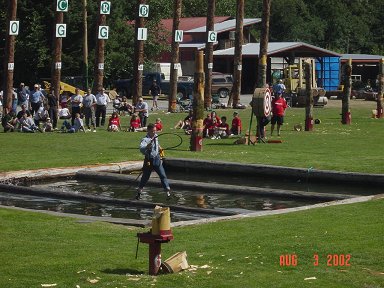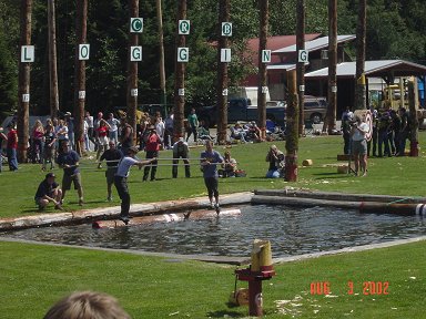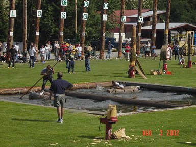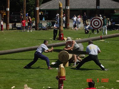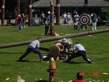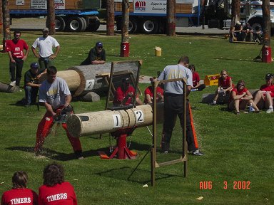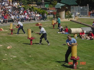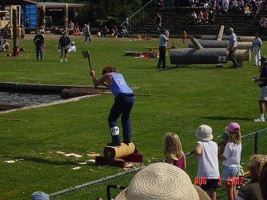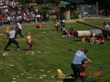 ![]() Here a Norwegian competitor uses an ax to split a log |